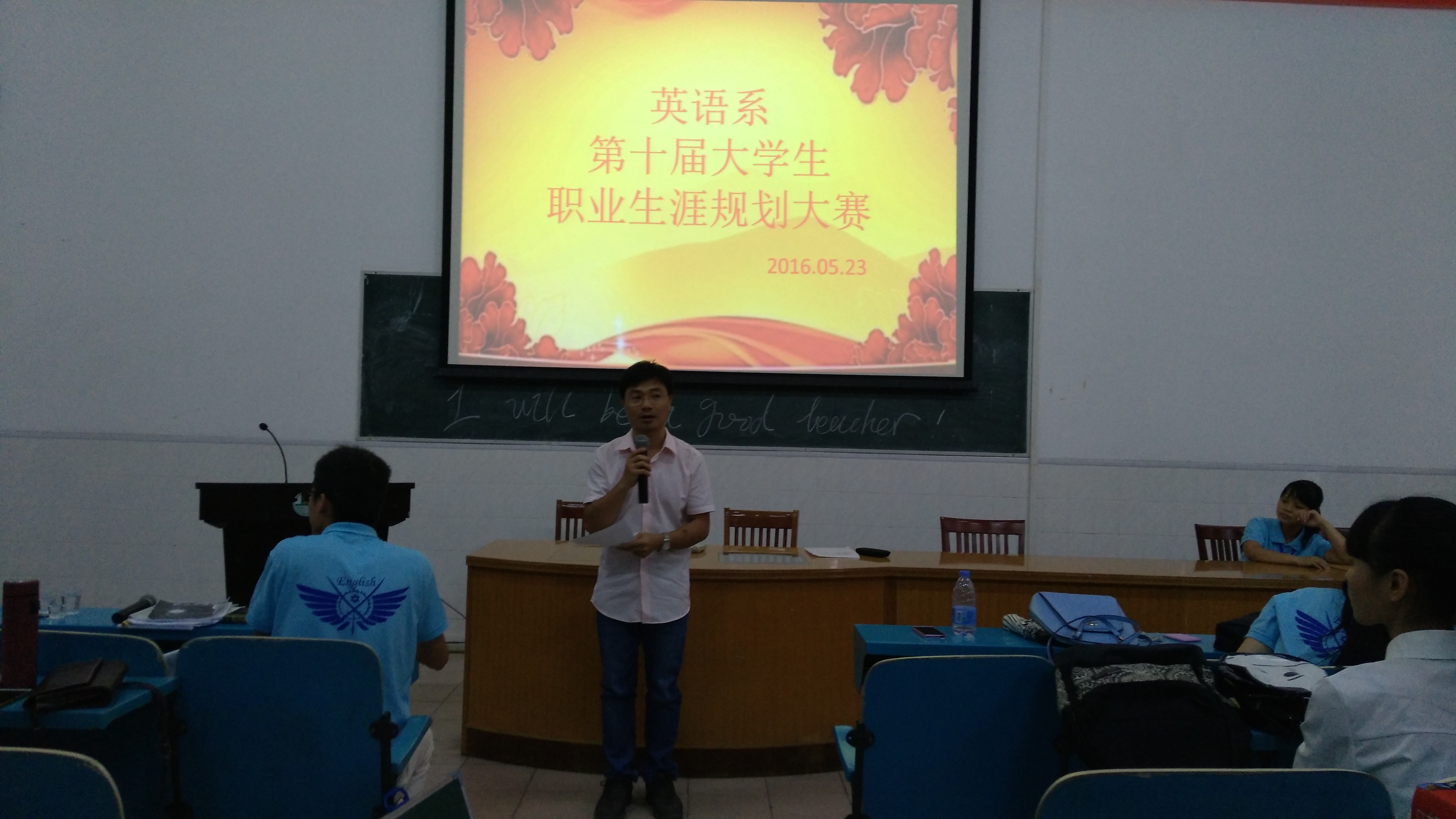 2016年5月23日16:30,英语系在师训楼218阶梯教室举行英语系第十届职业生涯规划大赛。傅冰玲主任、315级全体师生出席了本次大赛。担任评委老师的有:谢克彬、罗英杰、韦焰文、朱海迎和杨兴勇老师。