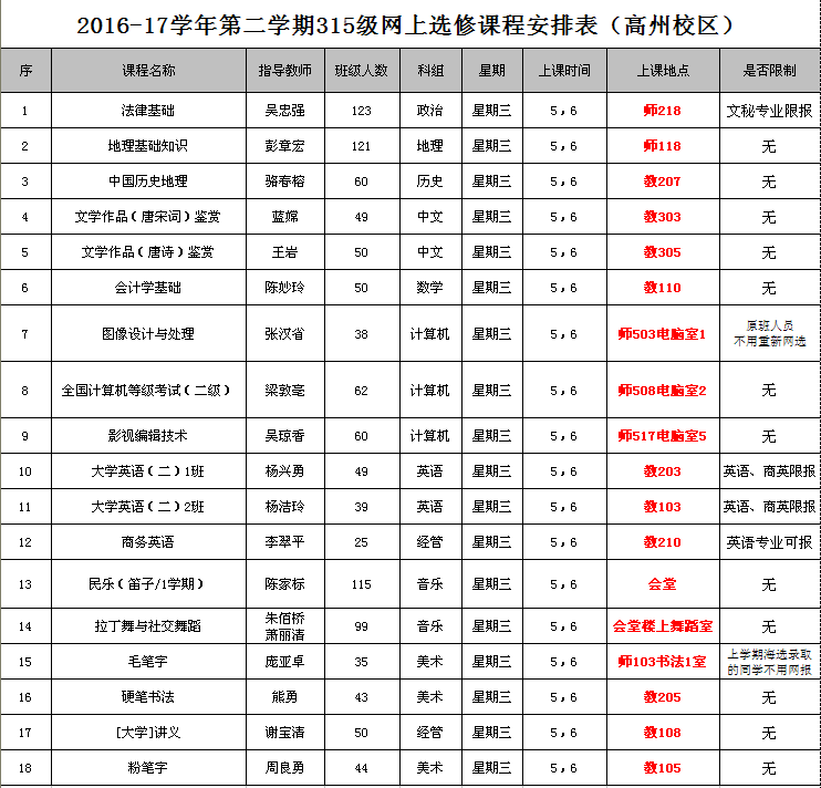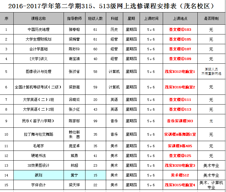 3月1、2日进行了315、513级网上选修报名,现将具体选修分班名单公布如下(见附件),请查阅本人所在选修课程及上课地点,本周起选修课正常开课。