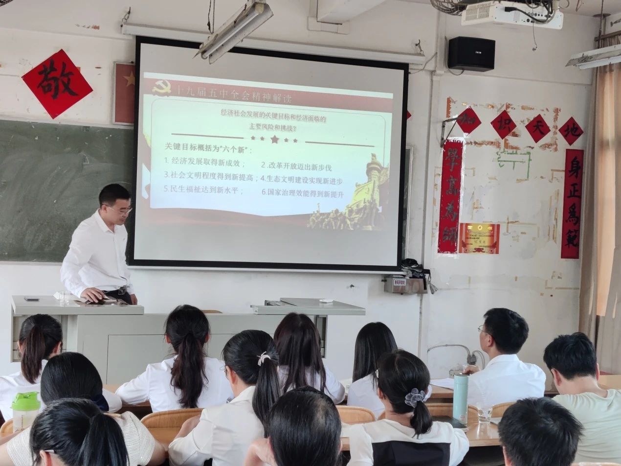会上,程昭玉书记首先和同志们一起回顾了全会审议通过的《中共中央关于制定国民经济和社会发展第十四个五年规划和二〇三五年远景目标的建议》,内容为:一、全面建成小康社会,开启全面建设社会主义现代化国家新征程;二、“十四五”时期经济社会发展指导方针和主要目标。三、坚持创新驱动发展,全面塑造发展新优势。四、加快发展现代产业体系,推动经济体系优化升级。五、形成强大国内市场,构建新发展格局。六、全面深化改革,构建高水平社会主义市场经济体制。七、优先发展农业农村,全面推进乡村振兴。八、优化国土空间布局,推进区域协调发展和新型城镇化。九、繁荣发展文化事业和文化产业,提高国家文化软实力。十、推动绿色发展,促进人与自然和谐共生。十一、实行高水平对外开放,开拓合作共赢新局面。十二、改善人民生活品质,提高社会建设水平。十三、统筹发展和安全,建设更高水平的平安中国。十四、加快国防和军队现代化,实现富国和强军相统一。十五、全党全国各族人民团结起来,为实现“十四五”规划和二〇三五年远景目标而奋斗。《建议》充分体现时代新变化,符合实践新要求,反映人民新期待,是开启全面建设社会主义现代化国家新征程,向第二个百年奋斗目标进军的纲领性文件,是今后几年乃至更长时期我国社会经济发展的行动指南。接着,程昭玉书记就国际国内形势进行分析,并重点学习了繁荣发展文化事业和文化产业,提高国家文化软实力和全党全国各族人民团结起来,为实现“十四五”规划和二〇三五年远景目标而奋斗两部分内容,并希望同志们力争学懂弄通《建议》内容,立足岗位做实做好立德树人工作,在开启全面建设社会主义现代化国家新征程中做出新的应有的贡献。