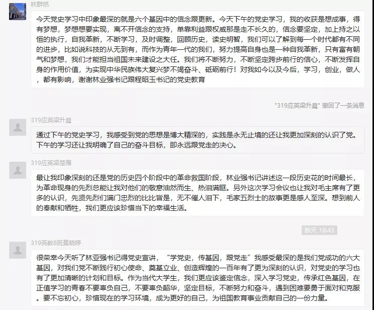 此次党课宣讲充分地激发了大家的爱国热情,引导大家正确认识党的光荣历史、伟大成就、宝贵经验、革命传统和优良作风。师生们感受颇深,纷纷在群里表达自己的收获与体会。