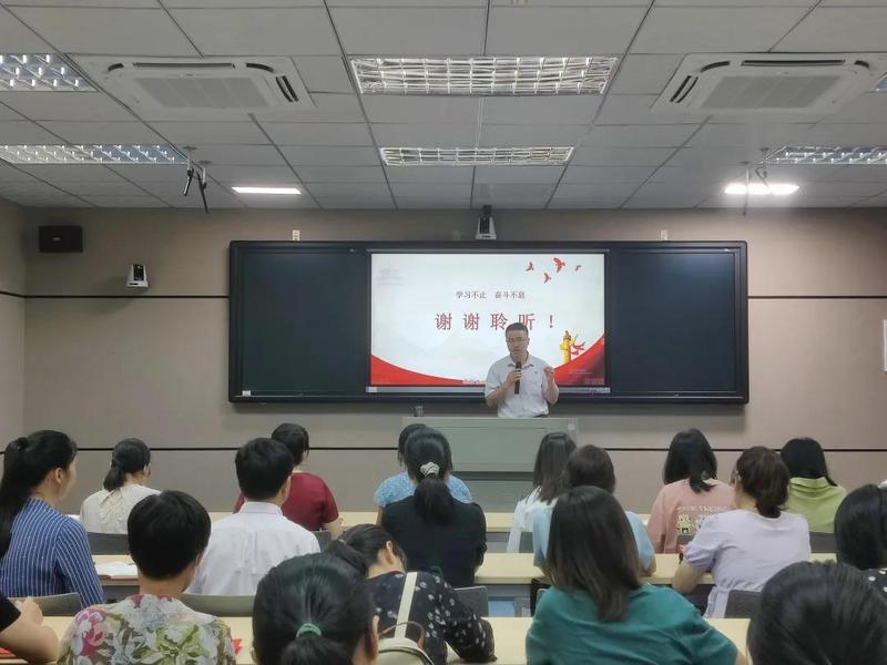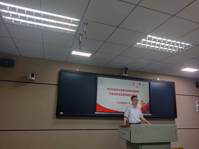 为加强党员和师生党史学习教育、爱国主义教育,激励师生继承革命先烈崇高精神,2021年6月7日,学校党委书记林业强同志应英语系党支部邀请,莅临外国语学院开展以“学党史,传基因,跟党走”为主题的红色宣讲活动,带领师生们回顾中国共产党带领人民坚持不懈奋斗的光辉历程,重温历史事件,致敬英烈人物,回眸历史瞬间。程昭玉书记、傅冰玲院长、外国语学院全体教师、以及2021年上半年39名发展对象参加了这次党史宣讲活动。