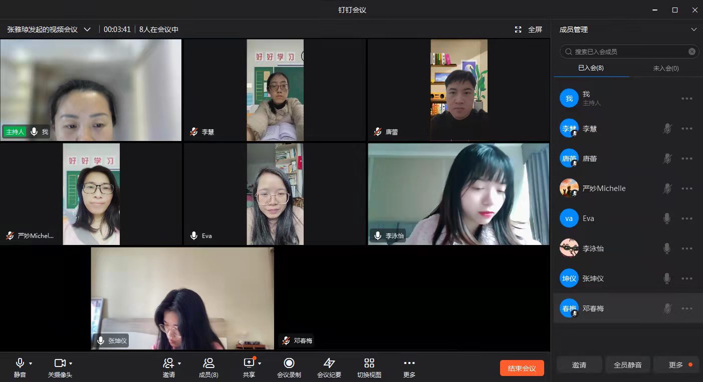 外国语学院商务英语教研组于2022年3月1日16时10分至18时00分在教研组钉钉群及腾讯会议开展本学期商务英语教研组的第一次教研组活动,本教研组八位老师都参加了活动。本次教研组活动有三项议程,由教研组组长张雅琼老师主持。