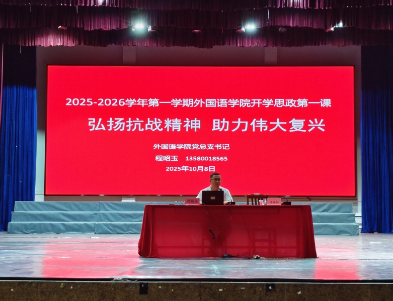 2025年是中国人民抗日战争暨世界反法西斯战争胜利80周年,为深入学习贯彻习近平总书记关于传承和弘扬伟大抗战精神的重要指示精神,全面落实党的教育方针,铭记历史、缅怀先烈,传承伟大抗战精神,厚植师生爱国爱党情怀,2025年10月8日,外国语学院党总支书记程昭玉在高州校区会堂讲授题为“弘扬抗战精神,助力伟大复兴”的思政第一课。外国语学院党总支专职副书记梁任权、辅导员及全体在校同学参加。