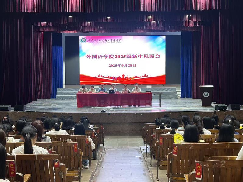 9月27日,外国语学院在高州校区会堂隆重举行2025级新生见面会。外国语学院党总支书记程昭玉,学院党总支专职副书记梁任权,学院综合办公室主任谢克彬,辅导员周春灵、韦焰文、丁汉民老师以及2025级全体新生共同参加。会议由程昭玉书记主持。