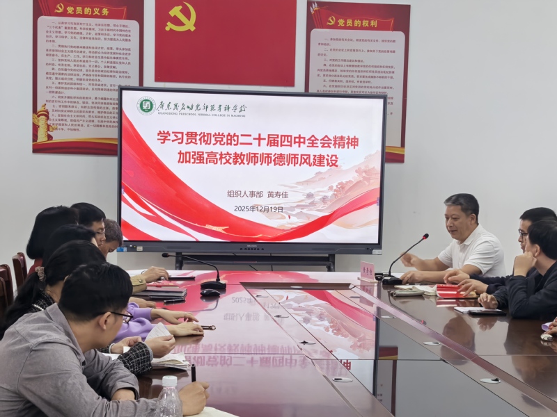 2025年,教育领域正处于深化改革、提升质量的关键时期,党的二十届四中全会为教育事业的发展锚定了新方向、提出了新要求。在此背景下,12月19日,学校党委委员、组织人事部部长黄寿佳亲临外国语学院,在高州校区丹青园党员活动室开展了一场以“学习贯彻党的二十届四中全会精神,加强高校教师师德师风建设”为主题的专题党课。会议由外国语学院党总支书记程昭玉主持,学院全体教师参与。